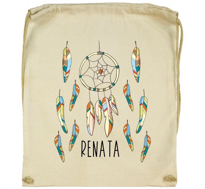 Workoplecak Łapacz snów z imieniem ma wzór z piórkami.