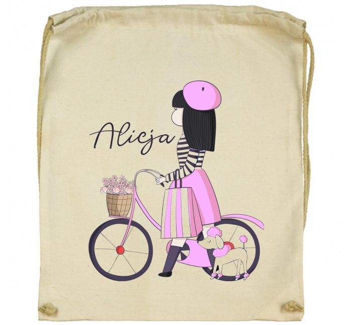 Workoplecak Panienka z rowerem i z imieniem dziecka lub bez jest doskonały na rowerowe wycieczki. Podaj imię w zakładce "personalizuj". Dziewczęcy nadruk dodaje uroku workowi. Workoplecak pomieści różne skarby potrzebne poza domem.